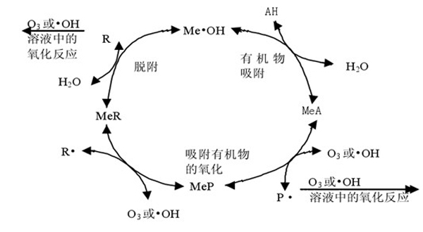 (1)、有機物被化學(xué)吸附在催化劑的表面,形成具有一定親核性的表面螯合物,然后臭氧或者羥基自由基與之發(fā)生氧化反應(yīng),形成的中間產(chǎn)物金額能在表面進一步被氧化,也可能脫附到溶液中被進一步氧化,一些吸附容量比較大的催化劑的催化氧化體系往往遵循這種機理。