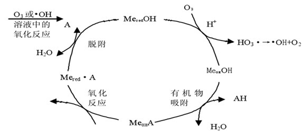 (2)、催化劑不但可以吸附有機物,而且還直接與臭氧發(fā)生氧化還原反應(yīng),產(chǎn)生的氧化態(tài)金屬和羥基自由基可以直接氧化有機物。